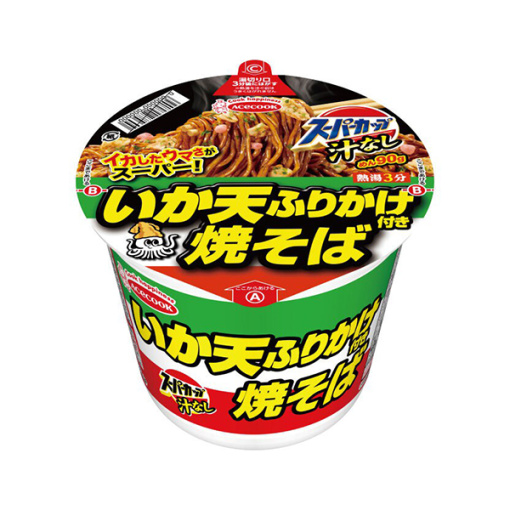 에이스쿡 슈퍼컵 오징어튀김 야키소바는 바삭한 오징어 튀김(いか天) 후리가케가 함께 들어 있어 감칠맛 넘치는 진한 간장 베이스 소스와 어우러지는 일본식 볶음면입니다