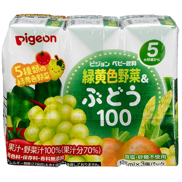 다섯 종류의 녹색과 노란색 야채를 사용하는 것입니다. (토마토, 당근, 아스파라거스, 시금치, 브로콜리), 포도 주스를 혼합하여 마시기 좋은 아기 음료. 과일 주스 + 야채 주스 100 % (과일 주스 70 %). 소금과 설탕은 사용하지 않습니다.
