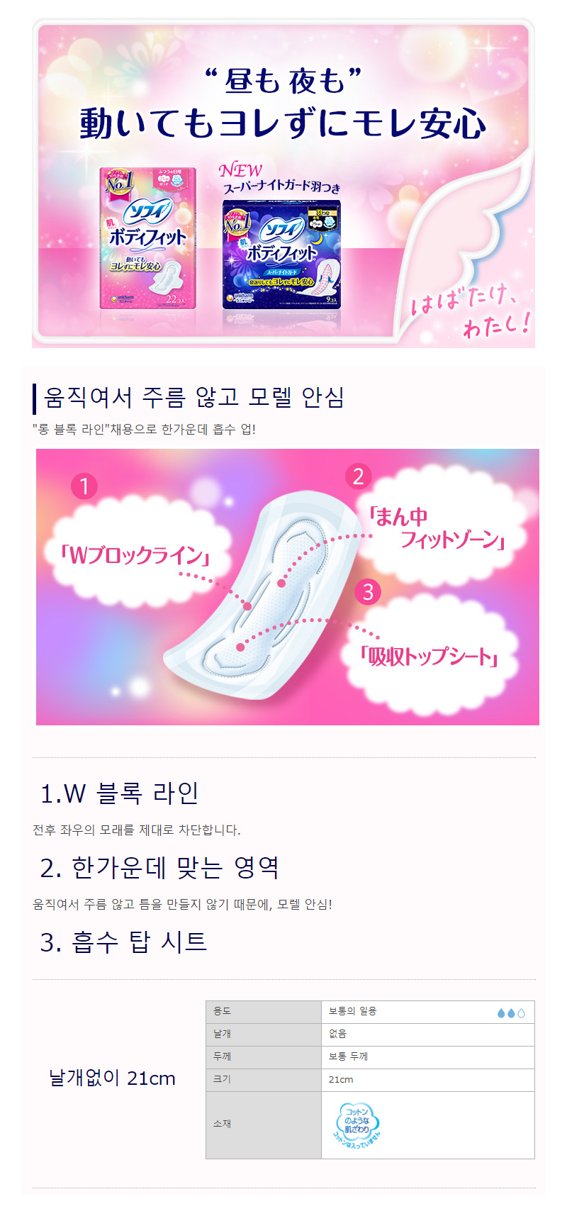초박흡수체로 속옷처럼 깔끔하게 밀착되며 전면 통기시트로 땀이 차지 않고 보송보송