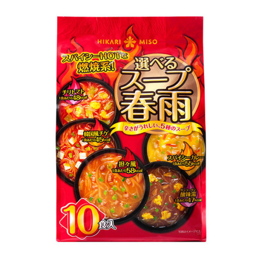 히카리 된장 선택할 수프 봄비 의 상품 설명 맵고 매운 다섯 가지 인스턴트 봄비 스프! ! “5 종의 수프 × 각 2 식 씩”[매운 카레] 매운 향과 조미료 치즈가 비장의 농후 한 맛의 스프 【산 라탕] 바지락과 치킨의 맛에 고추의 매운맛을 듣지 한 상쾌한 산미가있는 스프 [탕탕 바람] 고추의 매운 맛에 고소한 참깨의 맛과 돼지 고기의 맛이 퍼지는 맛 매운 수프 [찌리토마토] 토마토의 신맛과 치킨의 맛으로 완성한 고추가 관건 매콤한 스프 【한국풍 찌개] 김치의 맛에 해물과 돼지 고기의 맛이 녹아 든 괴로움 우수 스프. 1 봉지 (10 食入) 매운맛이 기쁘다! 5 종류의 당면 스프 히카리 된장 “선택할 스프 당면 매운 HOT ‘는 5 가지 매운 & 뜨거운 국물을 아소토 한 봄비 스프입니다. 매운 것을 좋아하는 분, 짜릿한 자극을 원하는 분, 몸을 안쪽에서 따뜻하게 싶은 분에게 추천합니다. 5 종류의 스프 : 매운 카레, 산 라탕 (산 라탄), 탕탕 바람, 한국풍 찌개, 찌리토마토 (각종 2 식 씩 들어) ※ 괴로움의 사고 방식에는 개인차가 있습니다. 매운 약한 사람이나 어린이는 충분히주의하십시오. 고추의 매운맛이 몸을 따뜻하게합니다. 히카리 된장 “선택할 스프 당면 매운 HOT ‘는 다양한 향신료가 들어 있습니다. ‘고추’가 5 종류의 스프 모두 들어 있으며, 진저 (생강), 마늘 (마늘), 후추 (가루),三商(산초), 로렐 등을 각각의 스프의 특징에 맞게 조미 고추의 매운맛 만이 아니다 맛을 만들어 내고 있습니다. 매운 & 뜨거운 수프의 특징 히카리 된장 “선택할 스프 당면 매운 HOT ‘의 맛의 특징 : [매운 카레] 매운 향과 조미료 치즈가 비장의 농후 한 맛의 카레 스프 【산 라탕] 바지락과 치킨의 맛에 고추 매운맛을 듣지했다 상쾌한 신맛의 산 라탕 스프 [탕탕 바람] 고추의 매운 맛에 고소한 참깨의 맛과 돼지 고기의 맛이 퍼지는 맛 매운 탕탕 수프 [한국풍 찌개] 김치의 맛에 해물과 돼지 고기의 맛 이 녹아 든 괴로움 돋보이는 한국풍 찌개 국물 [찌리토마토] 토마토의 신맛과 치킨의 맛으로 완성한 고추가 관건 매콤한 토마토 수프 1 체의 칼로리는 58kcal 이하 히카리 된장 “”선택할 스프 당면 매운 HOT “1 체의 칼로리는 45kcal~58kcal입니다. 도시락과 함께 먹거나 아랫배 (아랫배)가 빈 때 먹는데 딱 좋은 양이 있기 때문에 다이어트중인 사람 도 추천합니다. [매운 카레 수프 당면] 1 체 55kcal 【산 라탕 수프 당면] 1 체 47kcal [탕탕 바람 수프 당면] 1 체 58kcal 【한국풍 찌개 국물 당면] 1 체 45kcal [칠레 토마토 수프 당면] 1 체 48kcal