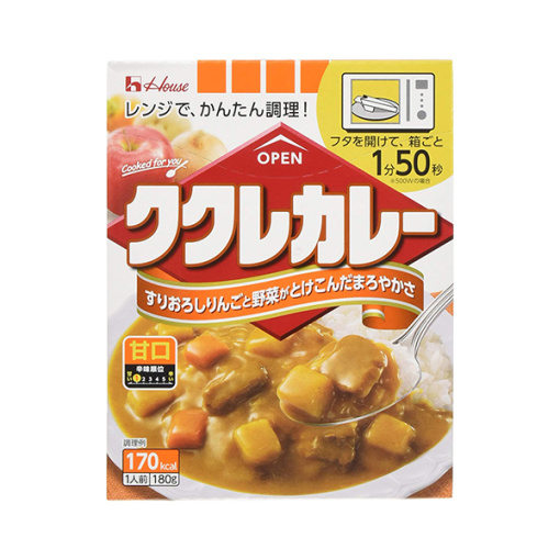 상품설명”하우스 쿠쿠레카레 순한맛”은 사과와 야채의 맛이 녹아 든 부드러운 맛 때문에 가정에서 주부가 고안하여 조리한 카레처럼, 아이부터 어른까지 좋아하는 카레를 즐길 수 있습니다 . 또한 전자 레인지 조리가 가능한 파우치이므로 상자 채 데우는 것만으로 간단하게 조리 할 수 ??있습니다. 원재료야채 (감자, 당근), 쇠고기, 우지돈지혼합유, 밀가루, 설탕, 전분, 사과 페이스트, 볶음 양파, 소금, 카레 가루, 효모 추출물, 생강 페이스트, 토마토 페이스트, 처트니, 버터 밀크 파우더, 향신료