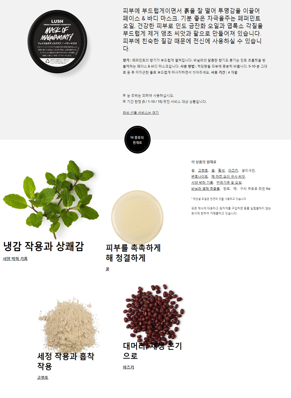 피부에 부드럽게 발라지며 노폐물을 떨어뜨리고 투명감을 보여주는 페이스, 바디 마스크. 각질을 부드럽게 제거 해주는 앵초 씨앗과 팥으로 만들었습니다. 페퍼민트의 향기. 바닐라의 달콤한 향기도 납니다.