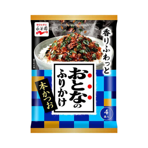 나가타니엔 어른의 후리가케 가다랑어는 가쓰오부시(본가쓰오)와 바삭한 김이 듬뿍 들어가 깊고 진한 풍미를 제공합니다.