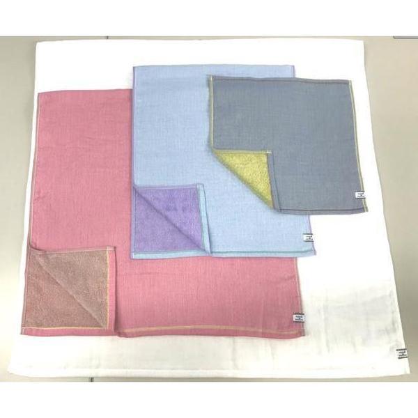 가늘고 꼬임이 적은 실로 짠 거즈와 꼬임이 없는 부드러운 실의 파일을 앞뒤로 조합한 더블 페이스의 수건입니다.