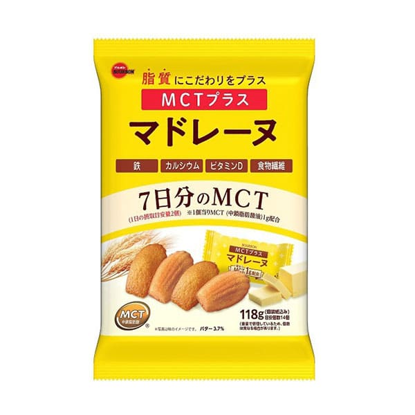 지질의 「질」에 주목한 한쪽 크기의 마들렌입니다. 지질의 일부에 MCT(중쇄 지방산유)를 사용하고 있습니다. 철·칼슘·비타민D·식이섬유들이.