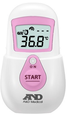 ON 버튼을 눌러 체온 측정 화면으로 전환합니다. 마크를 확인한 후 이마를 향해 START 버튼을 눌러 체온을 측정합니다.
