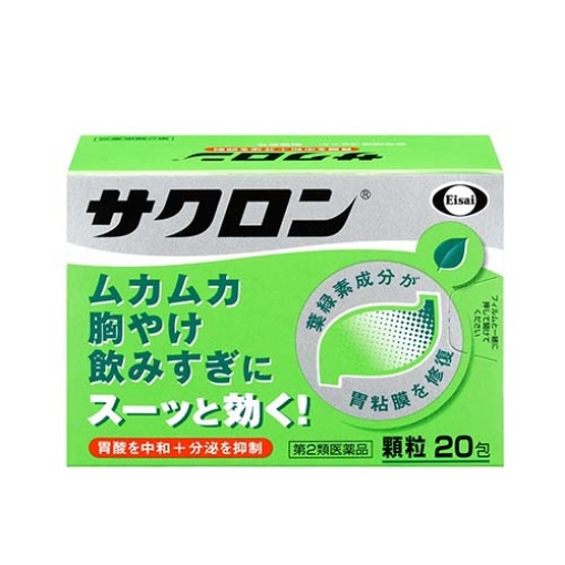 (제 2 류 의약품) [사쿠론 제품 상세]● 사쿠론은 지나치고했다 위산의 작용을 약화 (중화) 분비를 억제하고, 균열 위 점막을 엽록소로 만든 녹색 성분으로 복구 · 보호합니다.● 메슥 메슥 · 속쓰림 · 과음. 사쿠론은 자연스럽게 마시면 자연스럽게 효과가 있습니다. [효능 효과]· 속쓰림, 과음, 복통, 위산 과다, 위 트림, 위부 불쾌감, 위부 팽만감, 위 배, 가슴 여종, 트림, 구역질 (메스꺼움, 배탈, 숙취 ?의 메스꺼움, 구역질, 구역질), 구토 【용법 용량】· 다음의 양을 식간 및 취침 전 공복에 물 또는 따뜻한 물로 복용하십시오.성인 (15 세 이상) … 1 회 1 포를 1 일 3 회8 세 이상 15 세 미만 … 1 회 1/2 포를 1 일 3 회8 세 미만 … 복용하지 않는 것이※ 식간은 식후 2 시간 정도 경과 뱃속에 먹은 것이 거의 없어지고있는 때입니다.★ 용법 용량 관련주* 어린이 (8 세 이상 15 세 미만)에 복용시킬 경우에는 보호자의지도 감독하에 복용시켜주십시오. 【재료】(3 포 (3.84g) 중)구리 클로로 휘린 칼륨 120mg무수 인산 수소 칼슘 … 1020mg침강 탄산 칼슘 … 1020mg수산화 마그네슘 … 960mgRoth 추출물 … 30mg첨가물 : 옥수수 전분, 히드 록시 프로필 셀룰로오스, L- 멘톨, 향료, 염화칼륨, 케이 히, 포비돈※ 복용 후 대변이 녹색이되는 경우가 있습니다 만, 구리 클로로 휘린 칼륨 (녹색)가 배설되기 때문에 그림 물감이며, 걱정하지 않습니다.※ 사쿠론에는 알루미늄을 포함하는 성분은 사용하지 않습니다. 【주의 사항】★ 사용상의주의<하지 말라>* 본제를 복용하는 동안 다음의 약을 복용하지 마십시오. / 위장 진통 진경제수유중인 사람은이 물질을 복용하지 않거나,이 물질을 복용하는 경우에는 수유를 피한다. (모유로 이행하고 아기의 맥박이 빨라지 수 있습니다.)<상담하기>* 다음 사람은 복용 전에 의사, 약사 또는 등록 판매자에게 상담하십시오.(1) 의사의 치료를 받고있는 사람(2) 임신부 또는 임신하고 있다고 생각되는 사람(3) 고령자(4) 약물 등에 의해 알레르기 증상을 일으킨 적이있는 사람(5) 다음의 증상이있는 사람 / 배뇨 곤란(6) 다음의 진단을받은 사람 / 신장병, 심장병, 녹내장, 갑상선 기능 장애* 복용 후 피부에 발진 발적, 가려움 증상이 나타난 경우에는 부작용의 가능성이 있으므로 즉시 복용을 중지하고 제품 설명서를 가지고 의사, 약제사 또는 등록 판매자에게 문의 바랍니다.* 복용 후 입 갈증, 변비, 설사의 증상이 나타날 수 있으므로 이러한 증상의 지속 또는 강화를 보인 경우는 복용을 중지하고 제품 설명서를 가지고 의사, 약사 또는 등록 판매자에게 상담하십시오.· 2 주 정도 복용해도 증상이 나아지지 않으면 복용을 중단하고 제품 설명서를 가지고 의사, 약제사 또는 등록 판매자에게 상담하십시오.★ 기타주의모유가 나와 어려울 수 있습니다.★ 보관 및 취급상의주의직사 광선이 맞지 않는 습기가 적은 서늘한 곳에 보관하십시오.· 소아의 손이 닿지 않는 곳에 보관하십시오.* 다른 용기에 바꾸어 넣지 마십시오. 또한 본 용기에 다른 약제 등을 넣지 마십시오. (오용의 원인이되거나 품질이 달라집니다.)· 1 포를 나눈 나머지를 복용 할 때는 봉투의 입구를 배치하여 보관하고 2 일을 초과하는 경우에는 복용하지 마십시오.· 사용 기간이 초과 된 제품은 사용하지 마십시오.