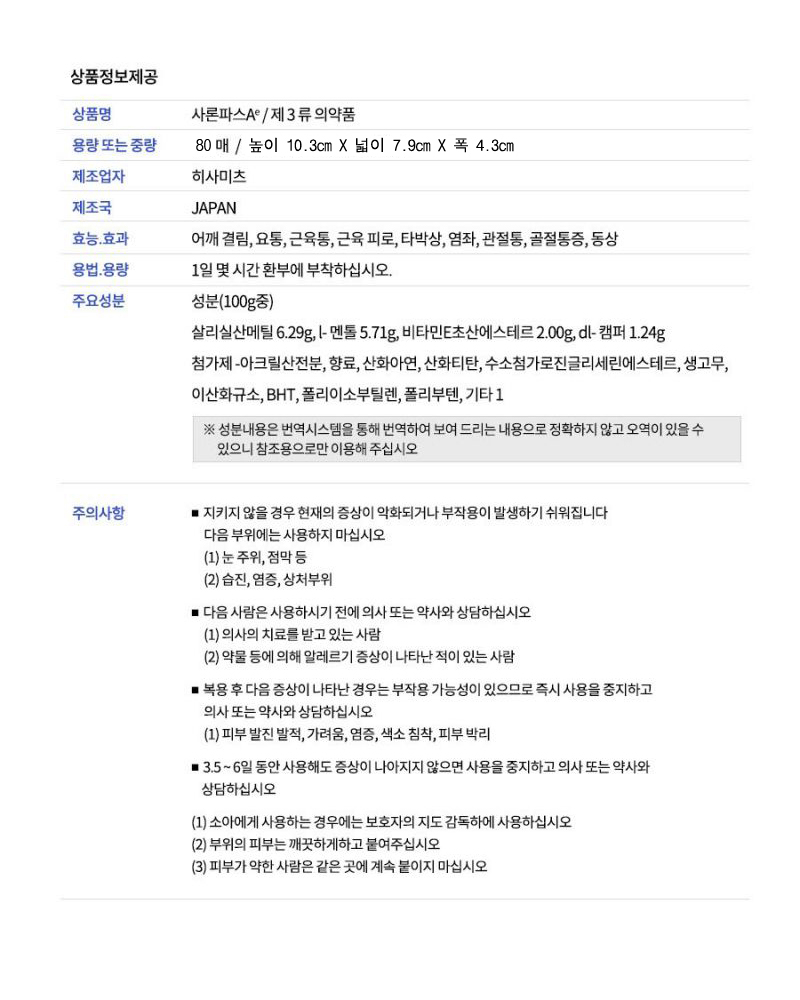 사론파스 A는 일본 **히사미츠**에서 제조한 통증 완화 및 근육 피로 해소용 파스로,