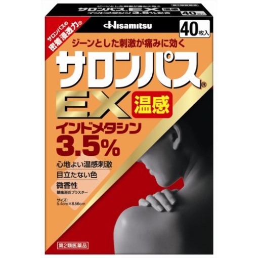 샤론파스 EX 온감(サロンパスEX温感)은 3.5% 인도메타신(INDOMETHACIN)을 함유한 온열 파스입니다.