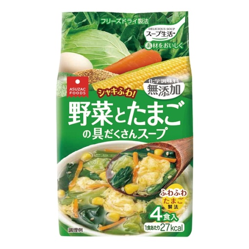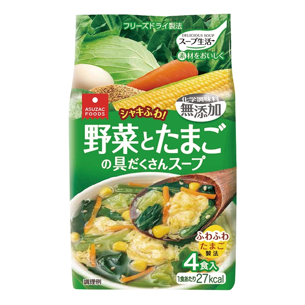 4종류의 야채와 달걀이 들어간 재료로 가득한 스프입니다. 어떤 메뉴에도 맞추기 쉬운 깔끔한 맛입니다.