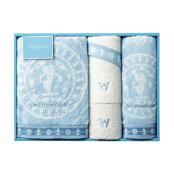 웨지 우드 블루’라고도 불리는 페일 블루를 기조로 한 전통 디자인의 타올 세트입니다.
