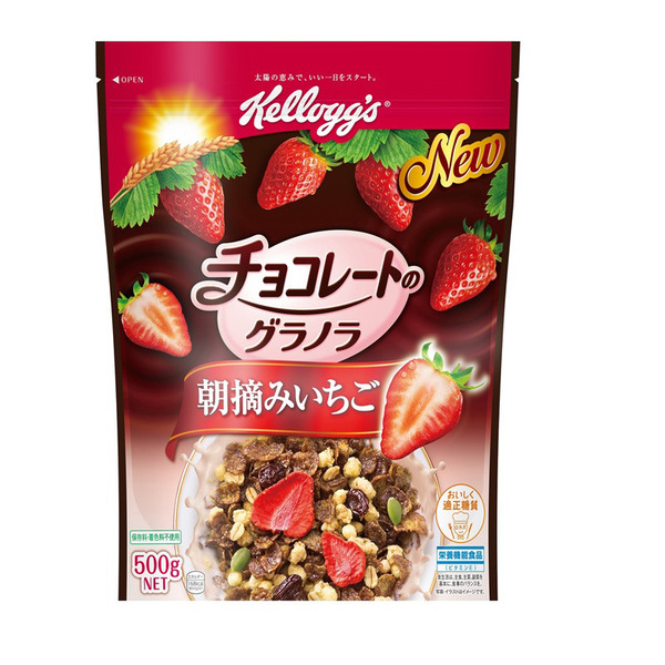 초콜릿 시럽을 코팅 한 콘플레이크와 크게 슬라이스 아침 따기 딸기를 동결 건조 한 것을 더한 구라노라입니다.초콜릿 플레이크 우유에 녹아 초콜릿과 딸기의 신맛이 먹기 좋게, 질리지 않는 맛으로 마무리하고, 건포도, 카보찌 ゃの 종도 들어 가족 모두가 즐길 먹을 구라노라입니다 .6 종의 비타민 · 철분 ·식이 섬유 등 영양이 균형있게 섭취합니다. 영양 기능 식품 (비타민 E)
