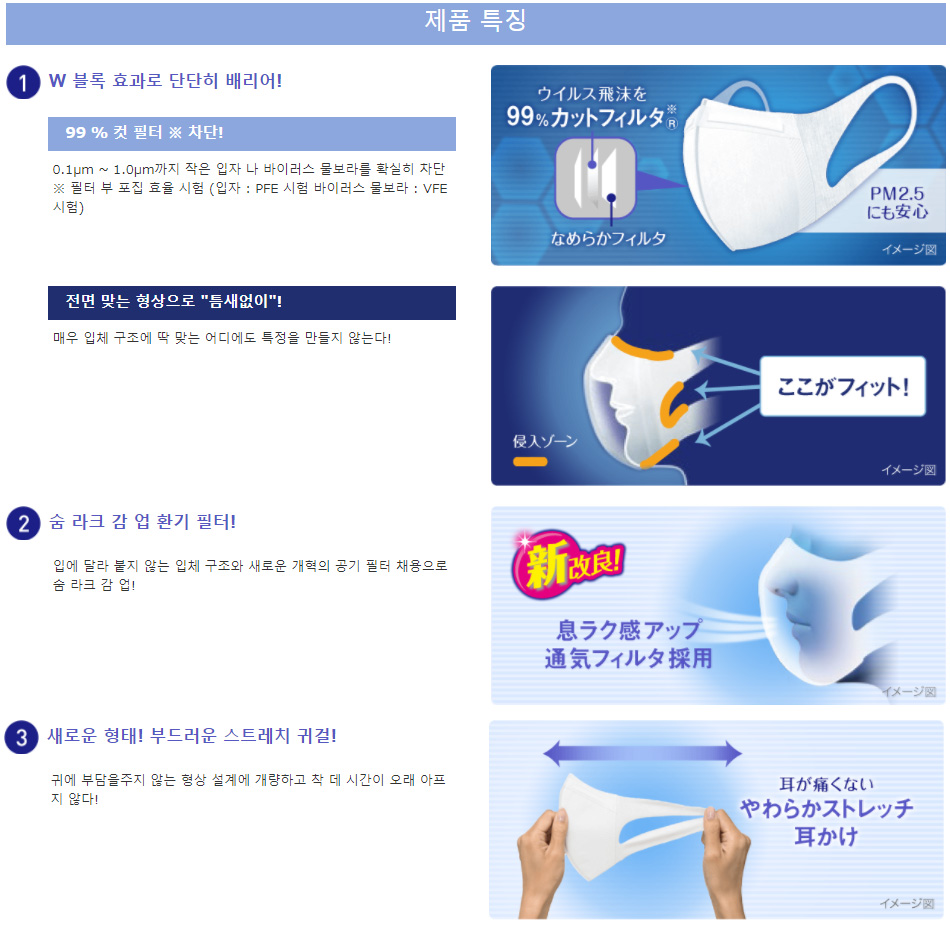 🚀빠른배송+2 편안하게 호흡 할 수있는 통기성 부직포 및 특수 형상 필터. 섬유가 가늘고 부드러운 부직포를 채용하고있는 기분 좋은 촉감입니다.