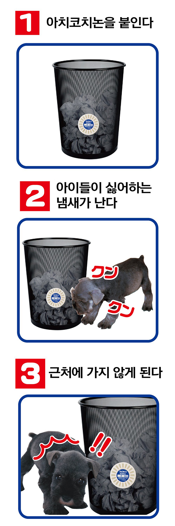 특징 강아지,고양이가 싫어하는 냄새를 맡게하여 학습시킵니다. 효과가 2 ~ 3 주 정도 지속됩니다. (상황에 따라 다름) 사용 직후 관심을 가지고 냄새를 맡을 수 있지만,잠시 맡으면 불편함을 기억하고 그 자리를 떠나게됩니다. 곤란한 위치에 붙이기만하면 되는 평면 (동전 크기)의 세련된 디자인입니다. 사용법 냄새가 그리 강하지 않기 때문에 실내에서도 신경이 쓰이지 않습니다. [화장실의 훈육] 배변판이나 화장실 이외에 소변보는 장소에 붙여주세요. 소변보는 곳이 아니다라는 것을 지속적으로 가르칩니다. [장난 훈육] 장난치는 위치의 코 높이에 붙여주세요. 장난치지 말라는 위치를 지속적으로 가르칩니다. 카지리논 (개)와 힛카키논 (고양이)를 병용하면 더욱 효과적입니다.