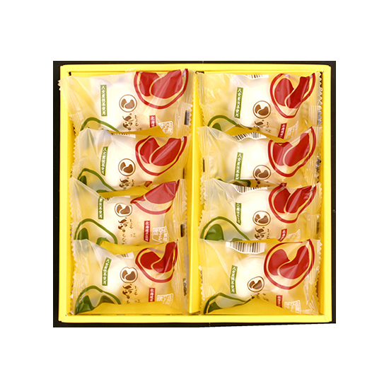 사가지역의 찹쌀 ‘히요쿠모치’를 사용한 향기로운 모나카.홋카이도산 팥과 야메산 말차로 팥소를 만들었습니다.한 봉지안에 두마리의 병아리가 나란히 있는 사랑스러운 모양은 사이좋은 가족에게 보내는 선물로도 딱입니다.
